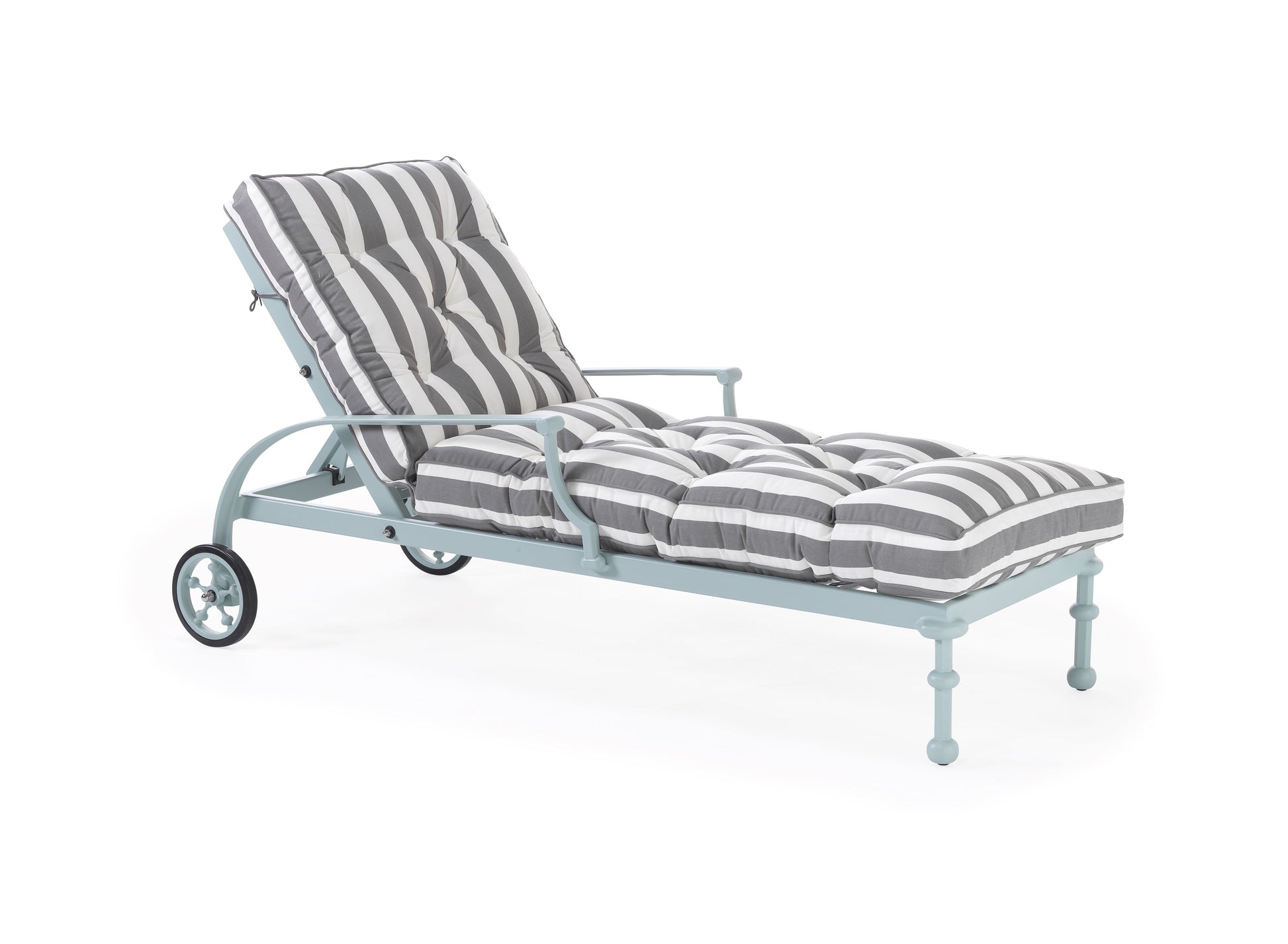 Våra solsängar flyttas lätt med två rejäla hjul. Ryggstödet kan ställas i helt plant läge eller i en upprest ställning, vad som passar för stunden. Dynorna fästs med knytband runt chassit och är enkla att ta bort om det börjar regna.